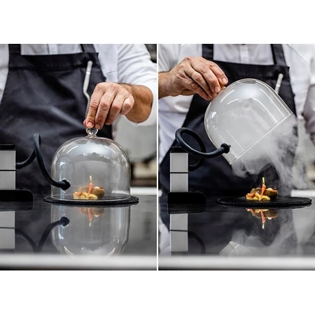 La cloche conçue en verre borosilicate de 17 cm de diamètre est résistante aux chocs ainsi qu’à des températures très basses ou très hautes. Facile d’utilisation, elle dispose d’une valve d’injection avec auto-fermeture en silicone (200°C).Compatible micro-ondes – four – congélateur.