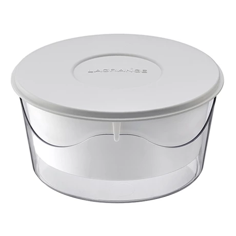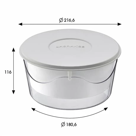 L’innovation de ce bol vient de sa forme ingénieuse qui permet en un tour de main de faire passer le pot d’une position basse de trempage pour la confection des spécialités laitières protéinés, à une position haute d’égouttage. Pratique, le bol offre une vision directe sur le niveau du petit lait grâce à son format transparent. Accompagné d’un bec verseur, le bol dévoue un égouttage du petit lait en toute simplicité dans l’évier.